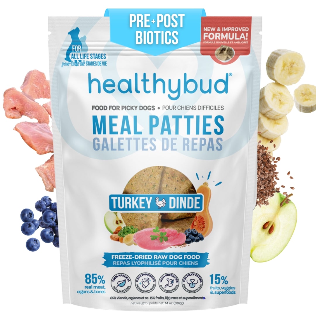 Healthybud’s easy to serve freeze-dried turkey meal bites provide the powerful benefits of raw food with the convenience of kibble. Packed with delicious & nutritious ingredients, this product was crafted with the pickiest eaters in mind to help your dog thrive from the inside out. Made with 85% organ, meat & bones and 15% fruits, vegetables & superfoods.