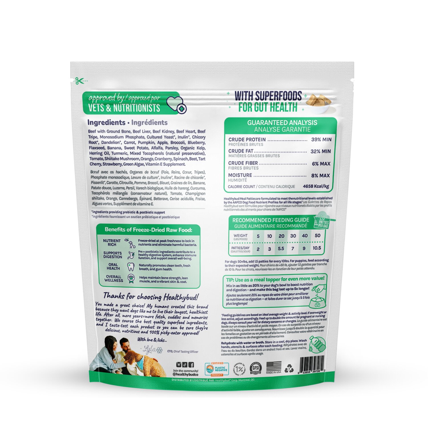Healthybud’s easy to serve, rehydratable freeze-dried beef patties provide the powerful benefits of raw food with the convenience of kibble. Packed with delicious & nutritious ingredients, this product was crafted with the pickiest eaters in mind to help your dog thrive from the inside out. Made with 90% organ, meat & bones and 10% fruits, vegetables & superfoods.