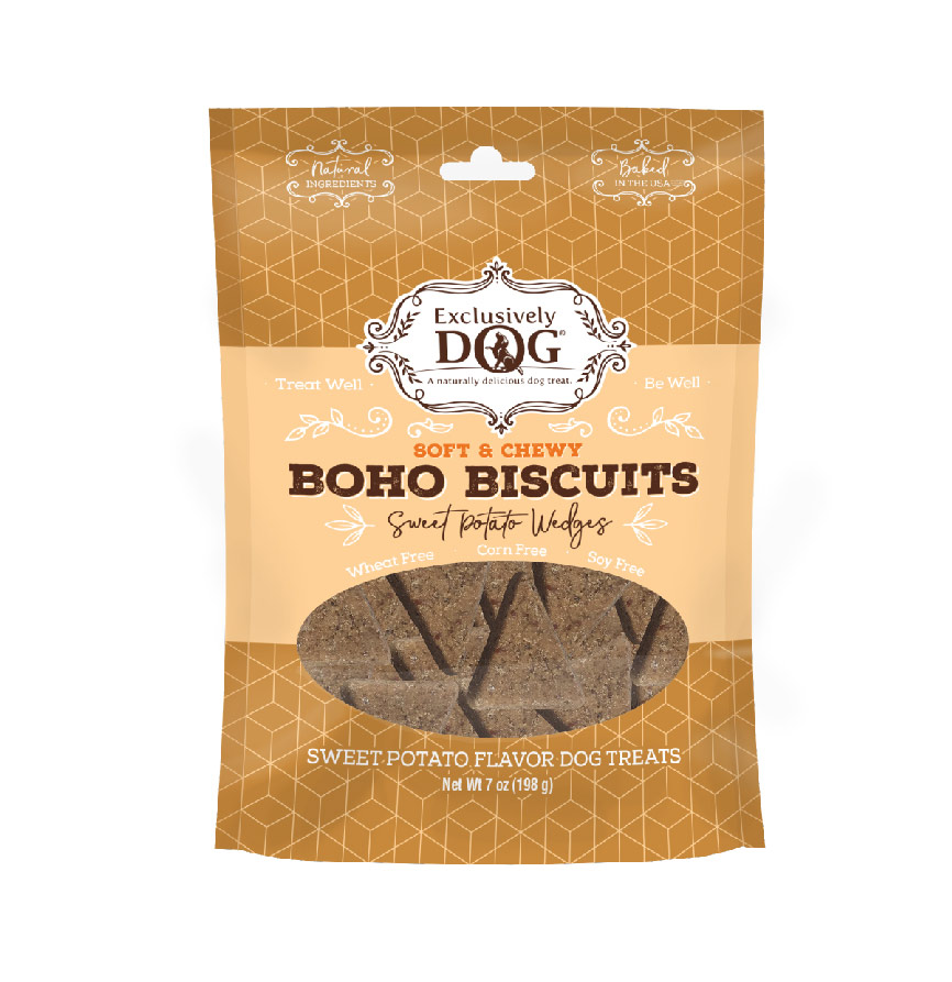 Soft & Chewy Boho Biscuits for the dog who aspires to be Wild and Free! Cute wedge shaped soft treats with the great taste of sweet potato and a hint of cinnamon. Wheat, Corn and Soy FREE! Vegetarian. 7 oz. Package