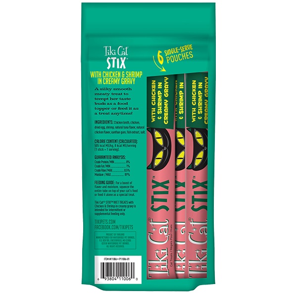 A silky smooth meaty treat to tempt her taste buds as a food topper or feed it as a treat anytime! Ingredients: Chicken broth, chicken, dried egg, shirmp, natural tuna flavor, natural chicken flavor, xanthan gum, fish extract, salt. Guaranteed Analysis: