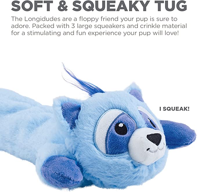 Our cute, cuddly, and very lengthy Longidudes squeaky stuffed dog toys keep going and going and going. The perfect dog activity toy for tossing, dragging, flapping, and interactive play with your pet, these soft stuffed fellas each come with 3 huge squeakers - 1 in the body and 2 in the head and tail. The squeaky pet toys are available in four styles and just one size – GIANT! Featuring K9 Tuff Guard technology for longer lasting fun, Longidudes dog fetch toys are a whole lotta toy!