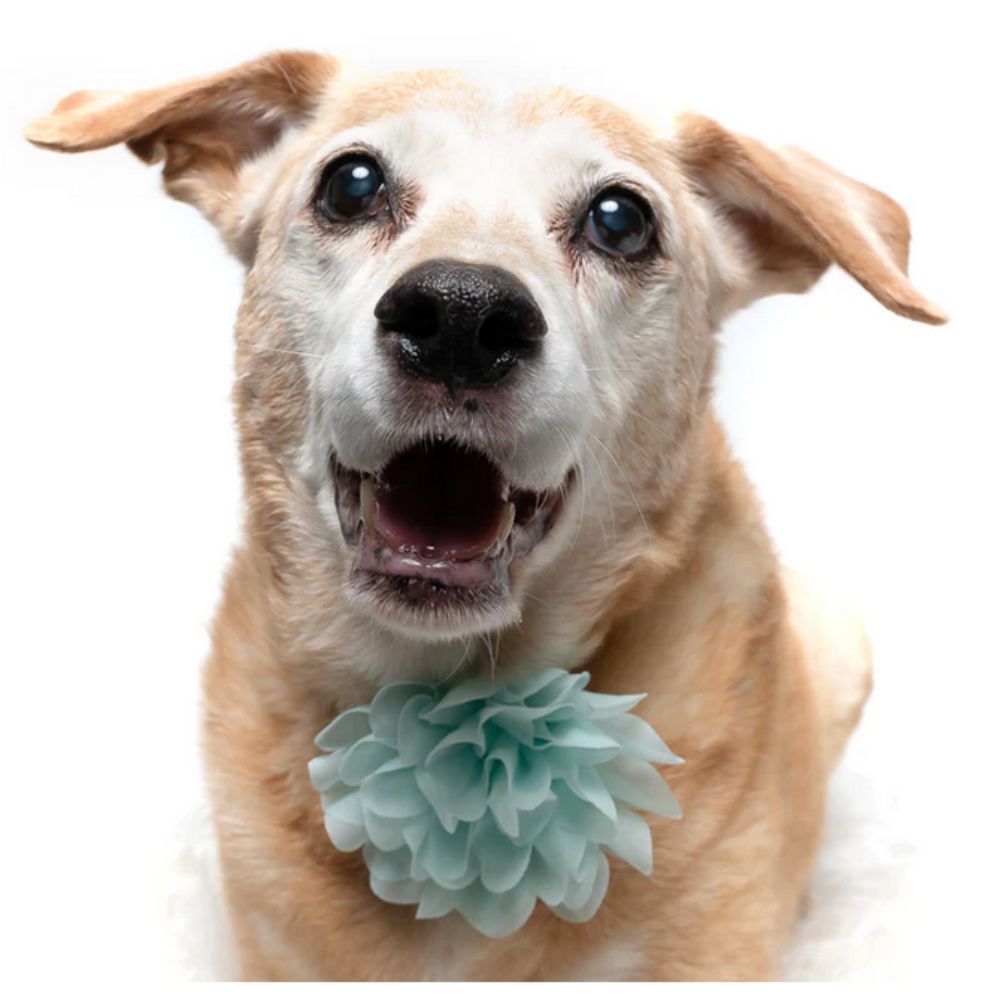 This flower has an elastic backing to easily slide onto the pets collar. The elastic backing stretches to fit over a 1 inch collar.
