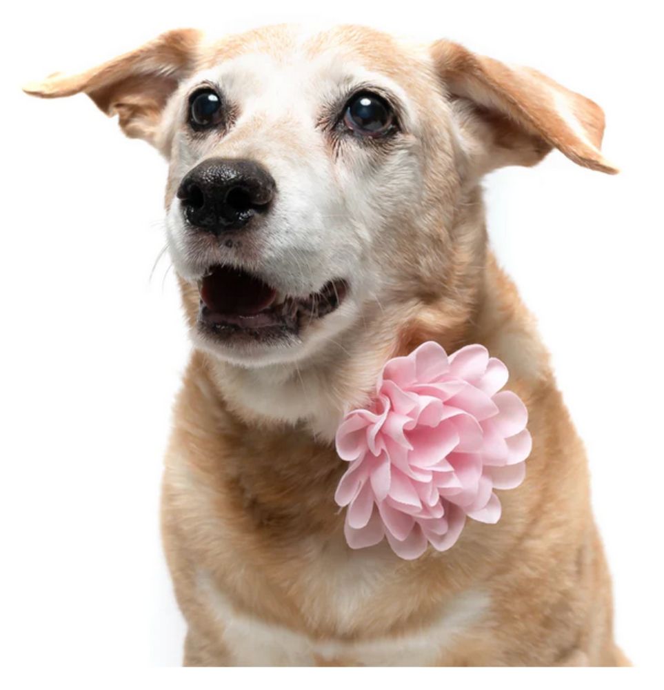 This flower has an elastic backing to easily slide onto the pets collar. The elastic backing stretches to fit over a 1 inch collar.