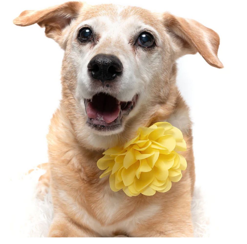 This flower has an elastic backing to easily slide onto the pets collar. The elastic backing stretches to fit over a 1 inch collar.