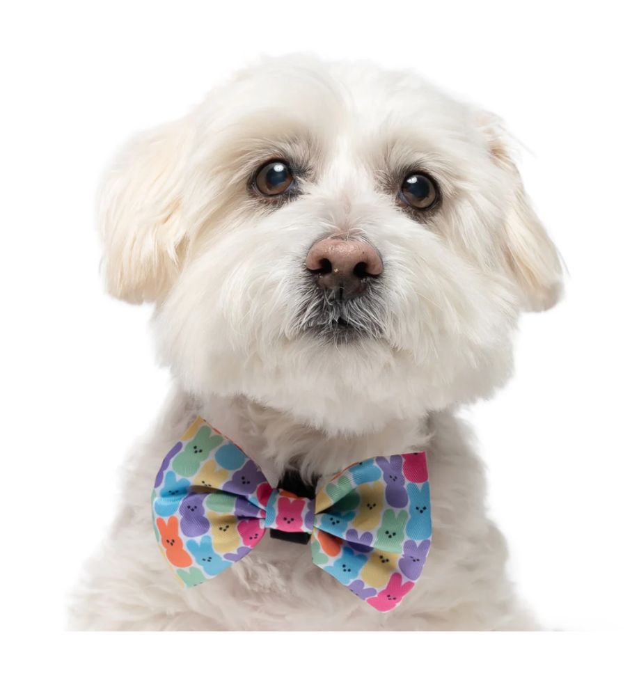 These bow ties have a velcro loop backing to attach to a dog collar or harness strap.