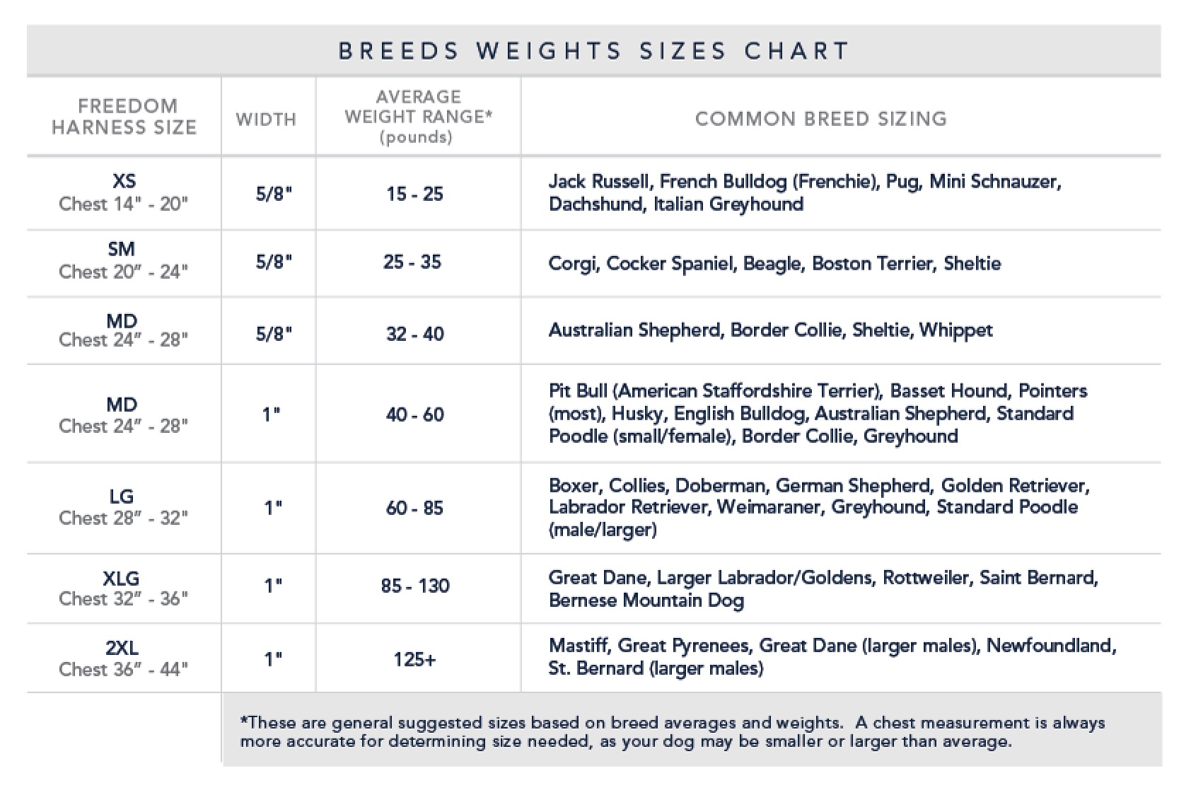 The Freedom No-Pull Harness is designed to fit any dog from 14 lbs all the way up to 250+ lbs.