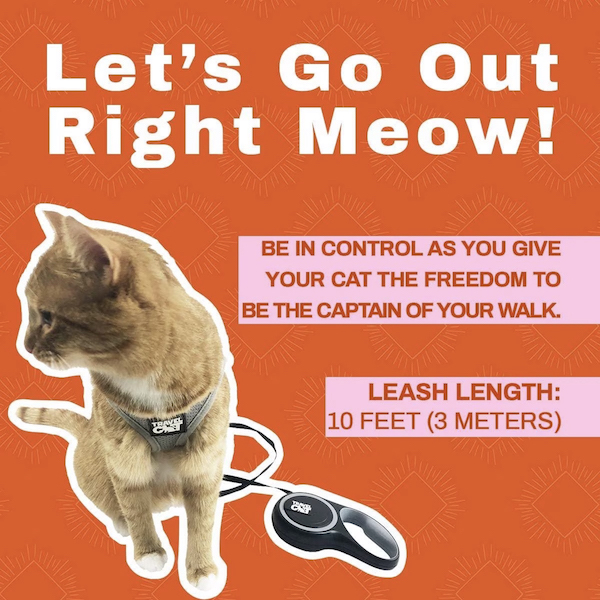 Reminder: never attach a leash to a cat’s collar! Cats have different anatomies from dogs, and it isn’t safe. The leash must be attached to a cat harness.