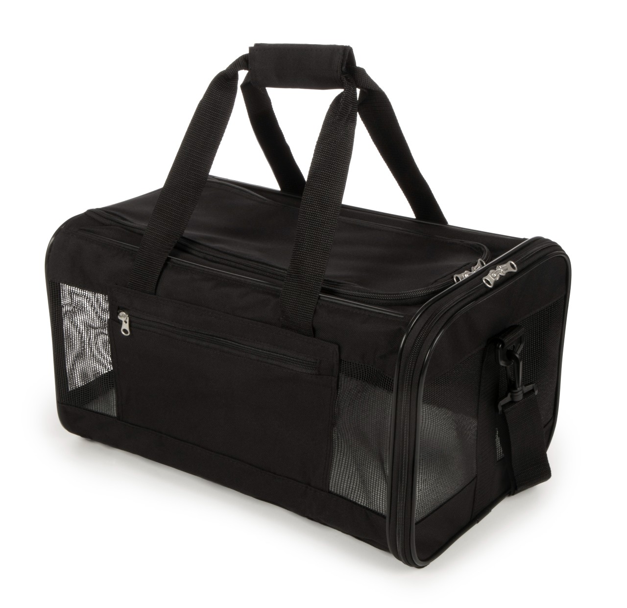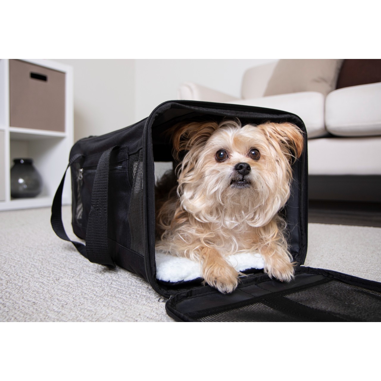 TrustyPup travel Easy Explorer a Guaranteed On-Board airline travel Pet carrier is compliant with most airline's specific rules and regulations, allowing pet parents to travel with peace of mind. Designed for small dogs and cats, size of carrier is 18" long x 11" wide x 10. 5" high. This carrier has a patented spring form frame which will fit under most airline seats. TrustyPup gives pet parents the best of all worlds: innovative products, stylish designs, environmental responsibility, and exceptional value with a variety of toys and beds to meet a dog's needs for play, retreat, rest, and fun! TrustyPup products are designed to meet child safety standards and are backed by our 100% satisfaction guarantee. If a customer is dissatisfied with a TrustyPup product for any reason, we will replace or refund it.