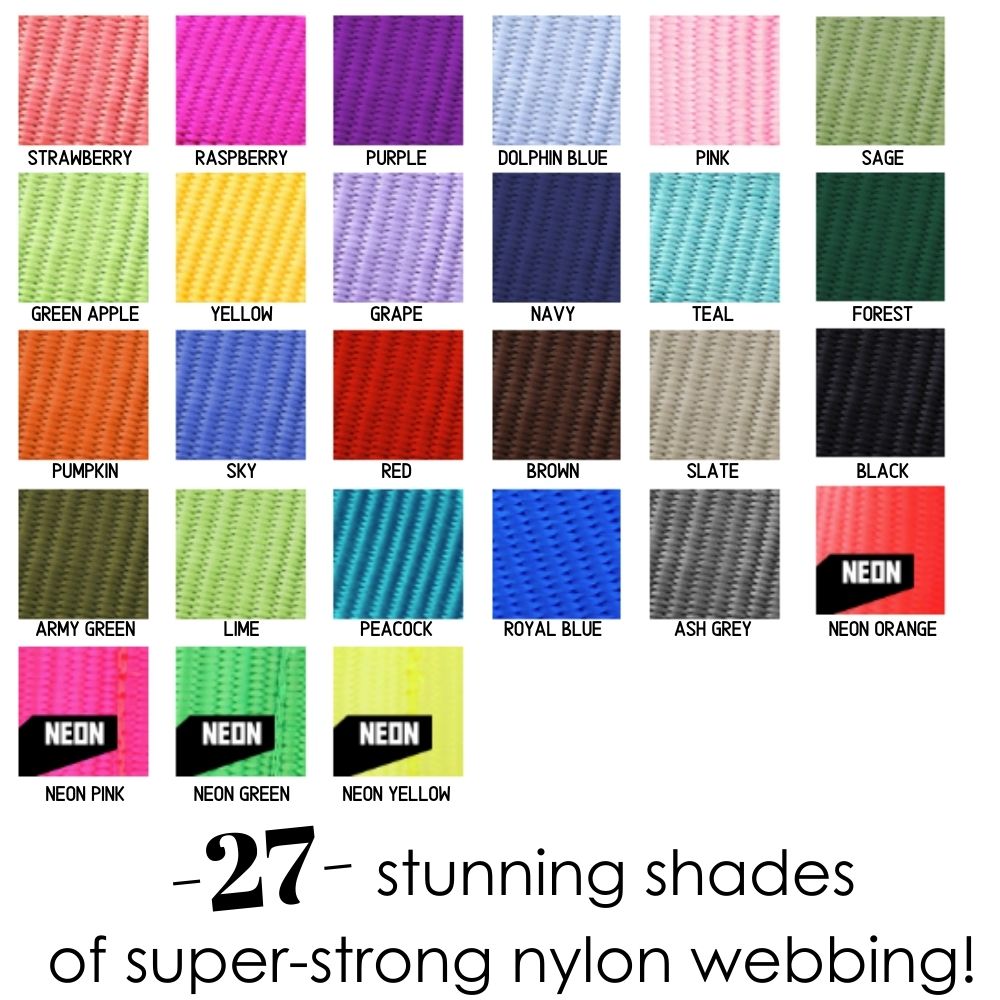 Our designer dog leashes are strong in construction and colorful with cutting edge in design. Choose between 27 vivid nylon webbing colors. We want your dog to look good and for you to feel safe.