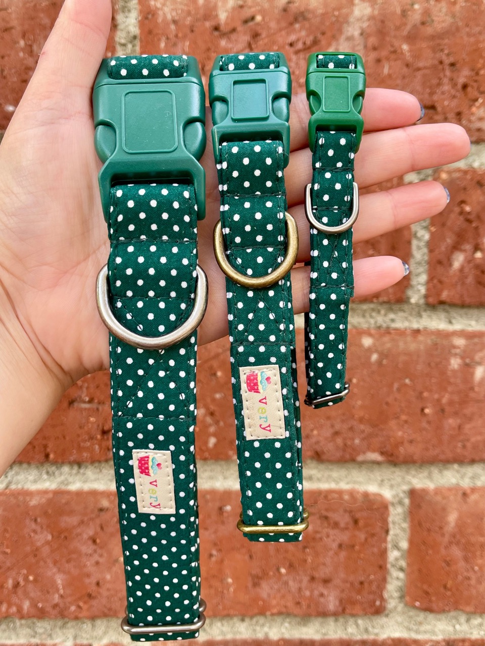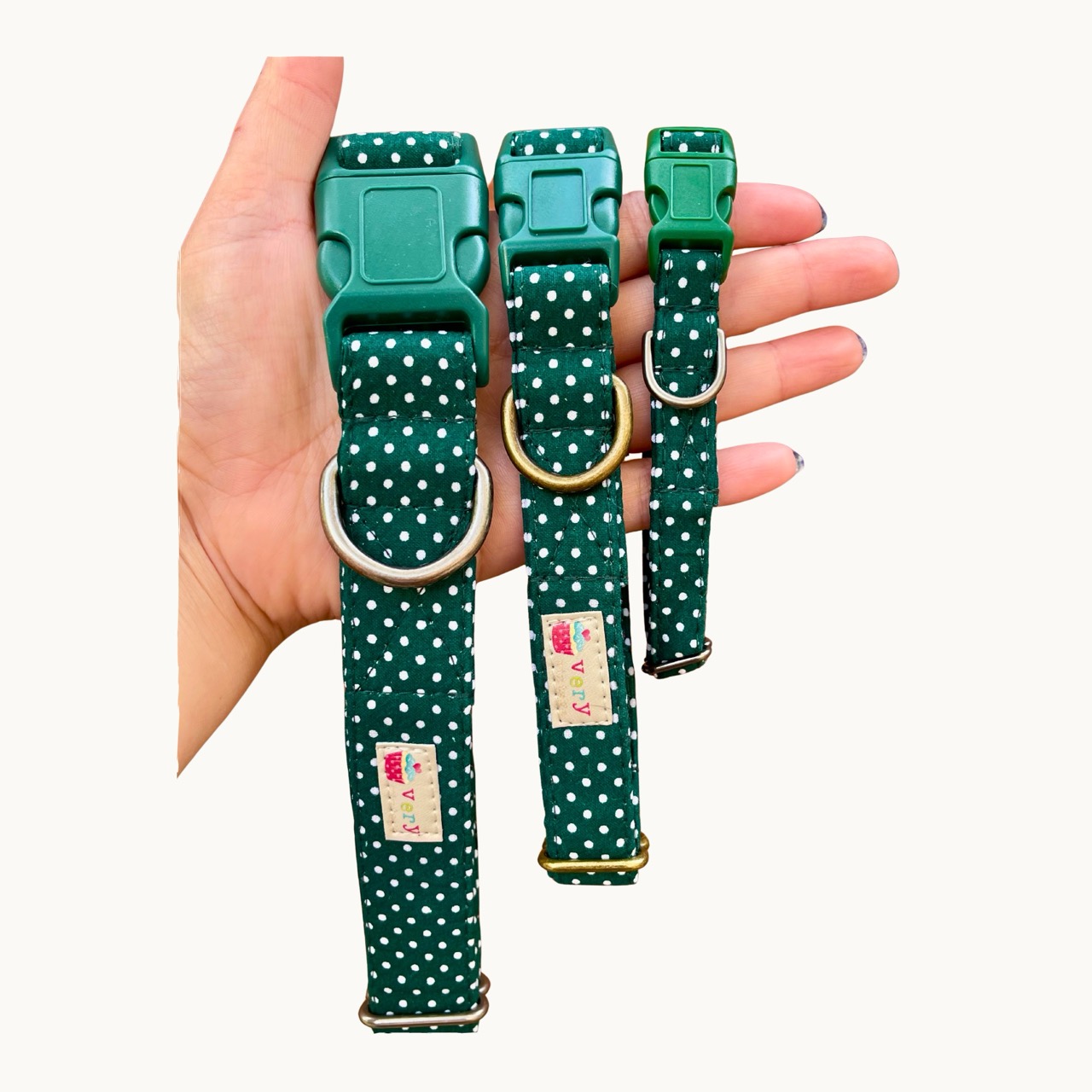 Hunter Green Polka Dot Pattern. Organic Cotton Dog & Cat Collars & Leashes. Eco-Friendly. Handmade in Los Angeles.