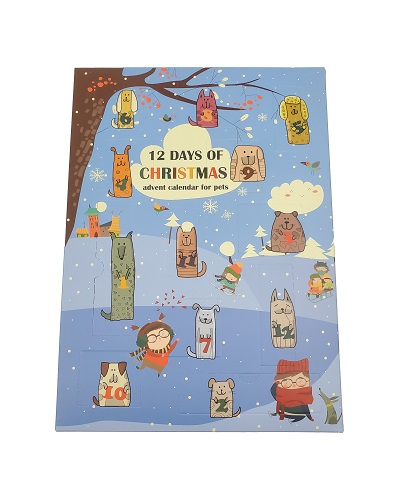 Hip Doggie's 12 Day Advent Calendar - This adorable 12 day calendar is designed to enable pet retailers to fill them with your selected treats or treats and accessories. Or choose to present the calendars empty with a selection of items that your customers can fill themselves, just like they do with stockings. Dimensions 8 1/2" x 11 1/2" x 1 1/2". Plastic tray easily slips in and out of box. Back of box has an attached easel to stand up and cutout hook to hang. Comes 5 per pack.