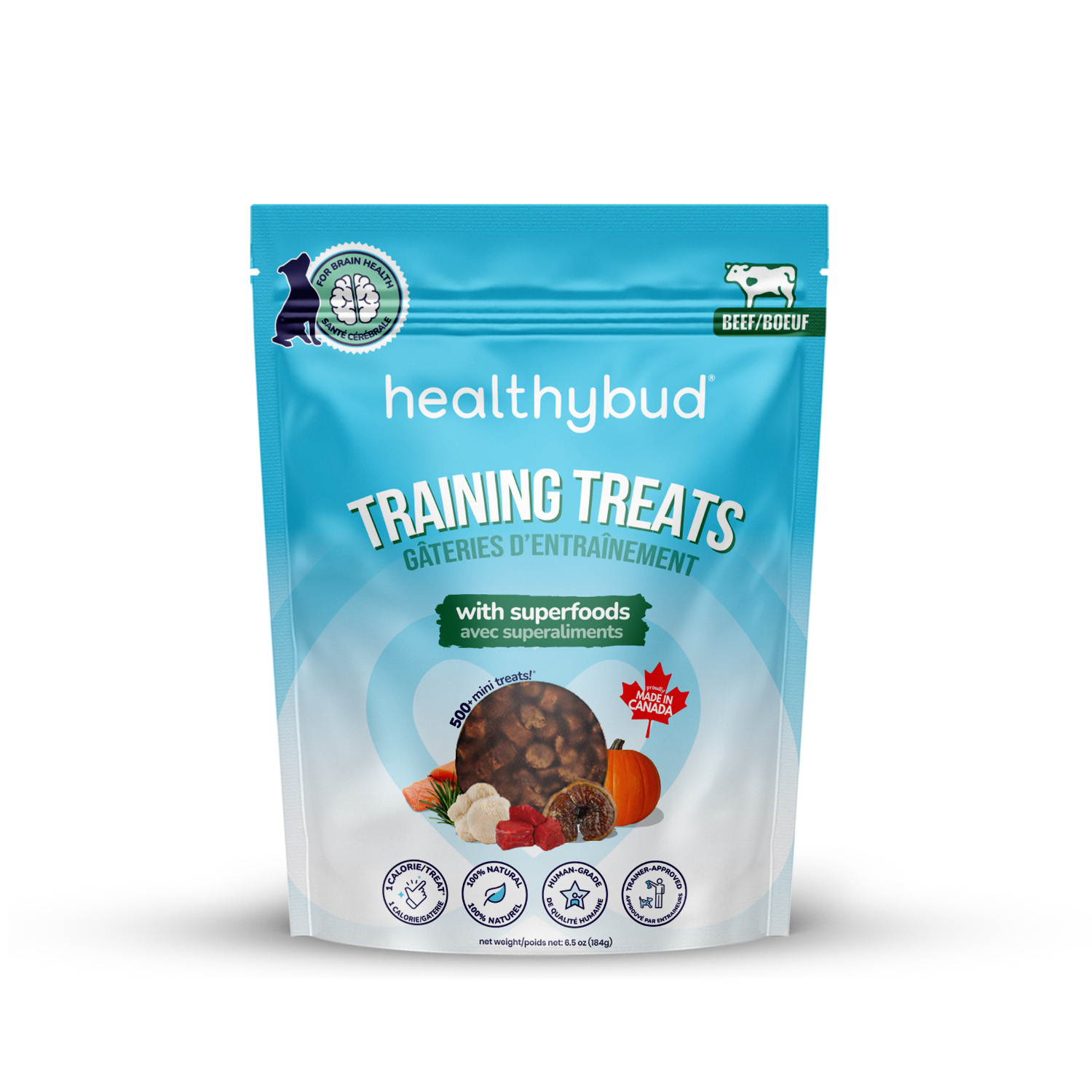 Discover Healthybud’s newest Beef Mini Training Treats for brain health. These unique, low-calorie treats are packed with superfoods like Lion's Mane, Reishi, and Salmon Oil to support brain health while delivering delicious taste and nutrition in every bite.