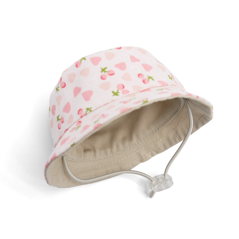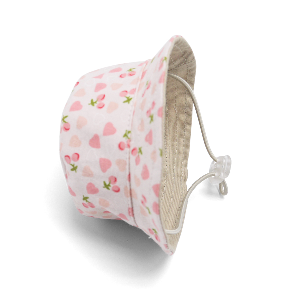 Bucket hat with light cherry, pink heart print and pull string tie design.