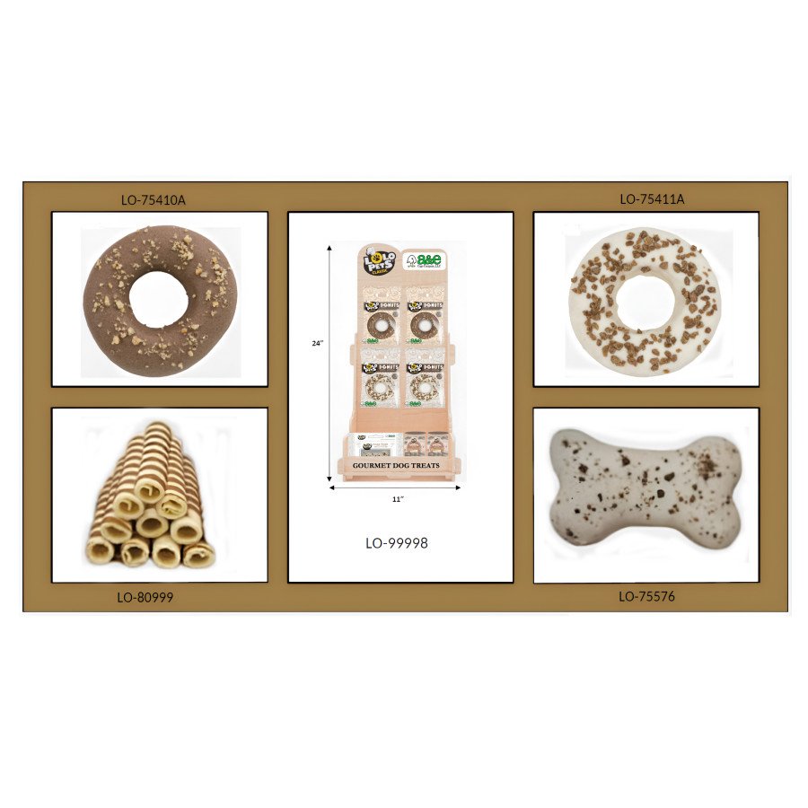 The display includes the following: 10 each LO-75576 Bone Shaped Cake - MINI (Vanilla); 12 each LO-80999 TASTIES Straws - Original (10ct); 32each LO-75144A Gourmet Donut - Vanilla - single pack; 32 each LO-75410A Gourmet Donut - Peanut Butter - single pack