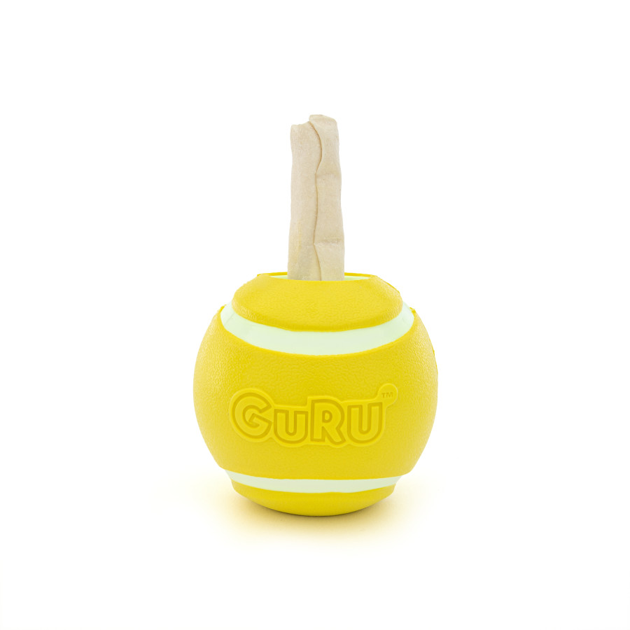 The Tennis Treat Ball is a larger and more fun version of the iconic tennis toy that keeps dogs occupied and busy for long periods of time. Squeak, treat, fetch and retrieve, the ball securely holds biscuits, bully sticks, rawhides, treat sticks and more. Provide the Tennis Treat Ball for long lasting chew sessions as well as games of fetch and retrieve without losing the treat! Made with Chew Pro, GURU’s ultra-durable, custom, non-toxic thermoplastic rubber formulated specifically for tough chew sessions. In the tennis yellow color that dogs know and love.