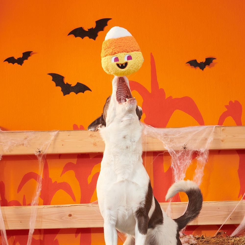 Hey, sweet fang! This vampire candy corn dog toy is here to haunt your dog's candy haul. Candy Cornivore comes with crazy crinkle, super soft fuzz, and a fluff-filled figure. Not to mention, he has a squeak tooth for playtime!