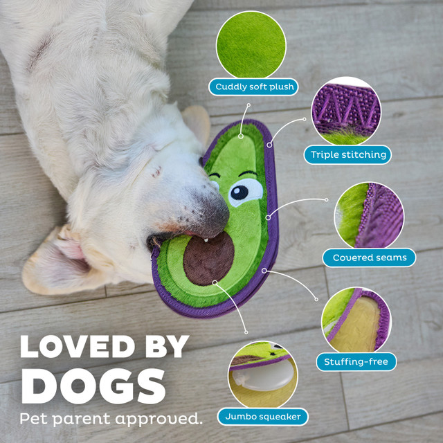 Tough Skinz is Outward Hound's latest tough toy innovation that combines the irresistible aspects of a plush toy with the premium strength of a molded toy. Backed by not one but TWO layers of durability on either side, Tough Skinz feature a strong fused chew-resistant lining beneath their soft plush exteriors, plus a thick molded layer underneath to provide the ultimate durability against the ruffest players out there. It's the best of both worlds, combining pet parent-approved strength with everything your dog loves about plush toys. The dual-layer protection has been put to the test by rigorous players and the most determined chewers to ensure long-lasting fun. For even more strength, each Tough Skinz toy features triple stitching as well as covered seams. Toss them, fetch, play a game of tug, our Tough Skinz are built to withstand whatever type of play your dog prefers. Stuffing-free and filled with a jumbo squeaker, this toy levels up the entertainment with superior durability as the ultimate perk.