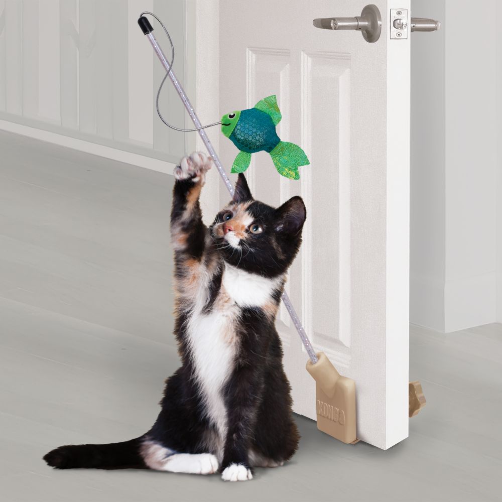 KONG Connects Angler Door Teaser ensures your cat has a catch of the day, every day! The fish at the end of the Teaser wand pole dangles and swings from a shiny elastic line, enticing instinctual batting, swatting, and capturing fun. The plush fish is filled with KONG Premium North American Catnip and crinkle paper to extend and energize play sessions. Attach the toy to the bottom of your door, connect the Teaser wand pole, and your cat will have hours of solo entertainment and daily exercise. Fits most doors for movable variety of play environments, keeping your cat curious and the hunt for the daily catch exciting.