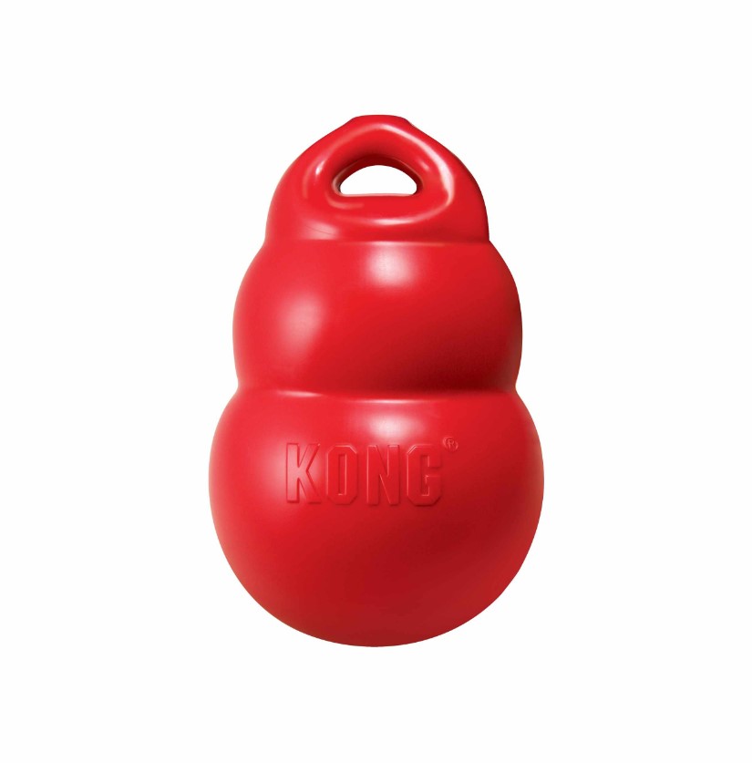 Dogs will go crazy for the KONG Bounzer™! Made in the over-sized classic KONG silhouette, The lighter material makes for a fun game of fetch and retrieve. The Bounzer™ compresses when grabbed by the dog, releasing air from the toy, which encourages self play. And, it bounces right back to its original shape. The top handle makes tossing even easier. Dogs will love to bounce, roll and play with these oversized, KONG-shaped toys!