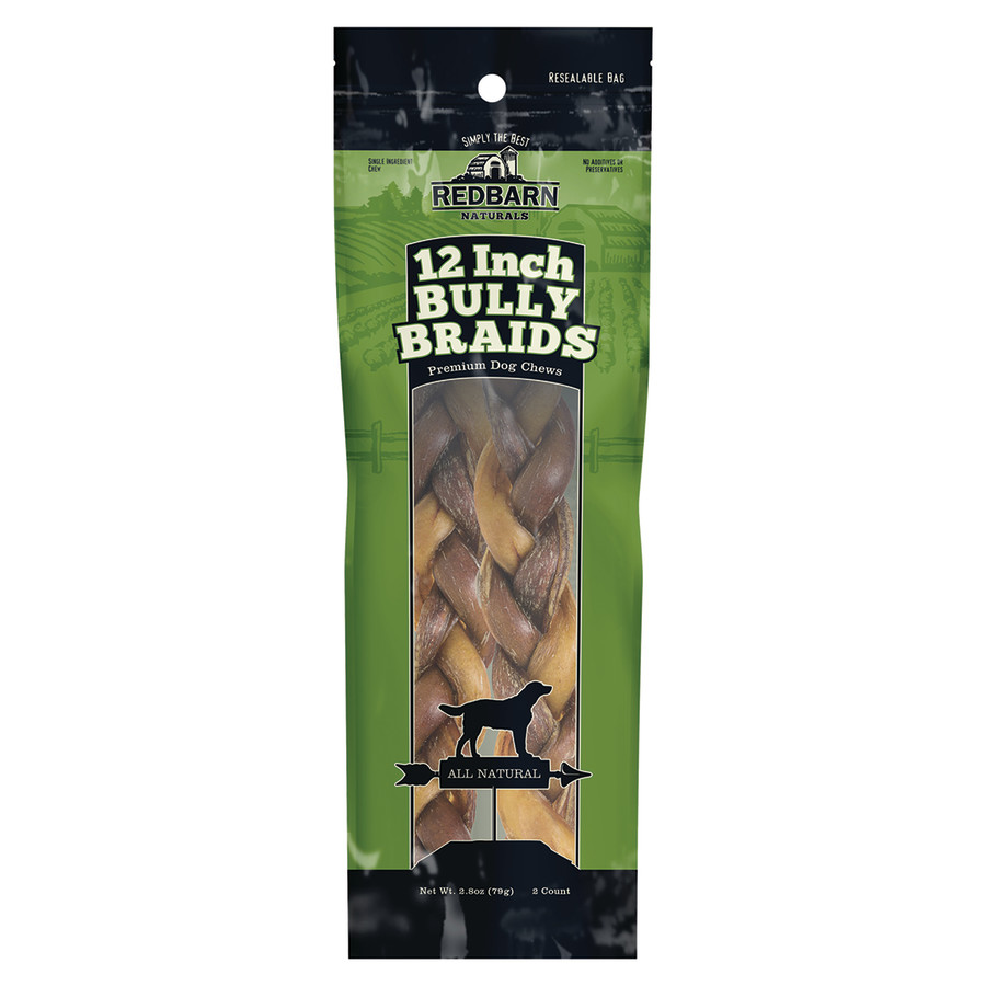 Redbarn Braided Bully Stick 12in 2pk These natural steer muscles are braided and roasted in their natural juices. Highly palatable this treat becomes chewy when wet helps keep teeth clean and provides hours of long lasting enjoyment