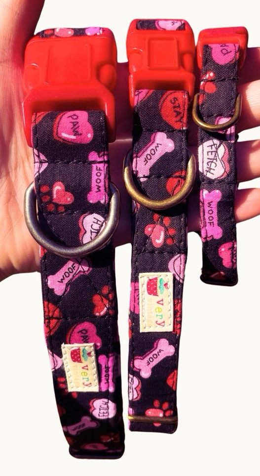 Black Valentine's Day Pattern. Organic Cotton Dog & Cat Collars & Leashes. Eco-Friendly. Handmade in Los Angeles.