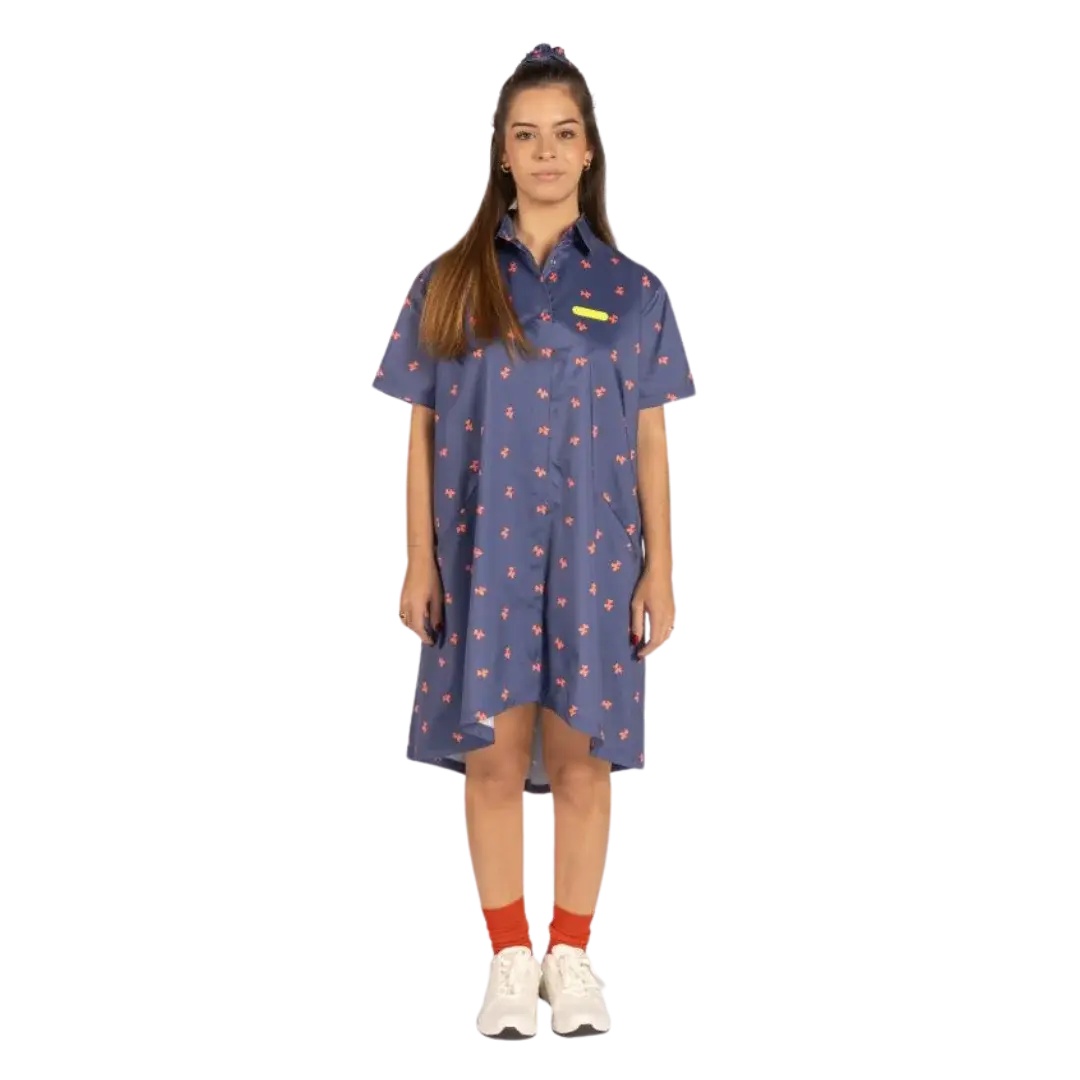 Features blue-and-coral print with canine motifs and shirt collar design give it an elegant yet functional touch