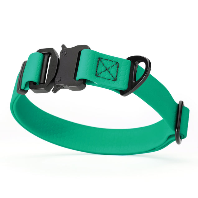 This dog collar with metal buckle is made from Hexa - a PVC coated webbing with honeycomb texture that is completely water- and odor resistant, soft to touch and does not stretch. No more worries about smelly and dirty collar – let your four-legged friend jump through puddles, run on the beach, play in the snow or rain and enjoy their walks in any weather and environment!