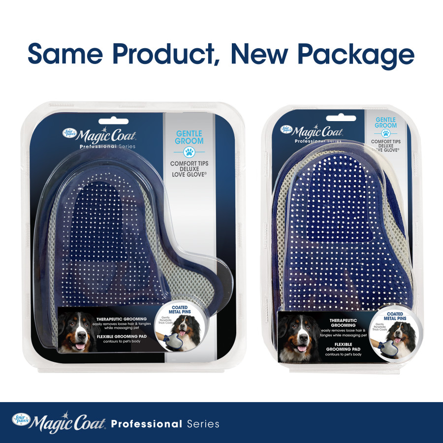 The Magic Coat Professional Series features premium multi-purpose pet grooming tools for a salon-like experience right at home. The Comfort Tips Deluxe Love Glove combines high-quality sturdy metal pins that effectively brush through thick coats with coated pin tips that are gentle on the skin. Loose hair and tangles are easily removed as the pet grooming mitt follows the natural contours of your dogs body without causing irritation. The dog grooming glove mitt massages the skin with every stroke, giving your dog a therapeutic experience while strengthening the bond between you and your best friend. Featuring a secure and adjustable strap, the Love Glove fits all hands. Our pet grooming glove brush is perfect for all coat types and can also be used for grooming cats!