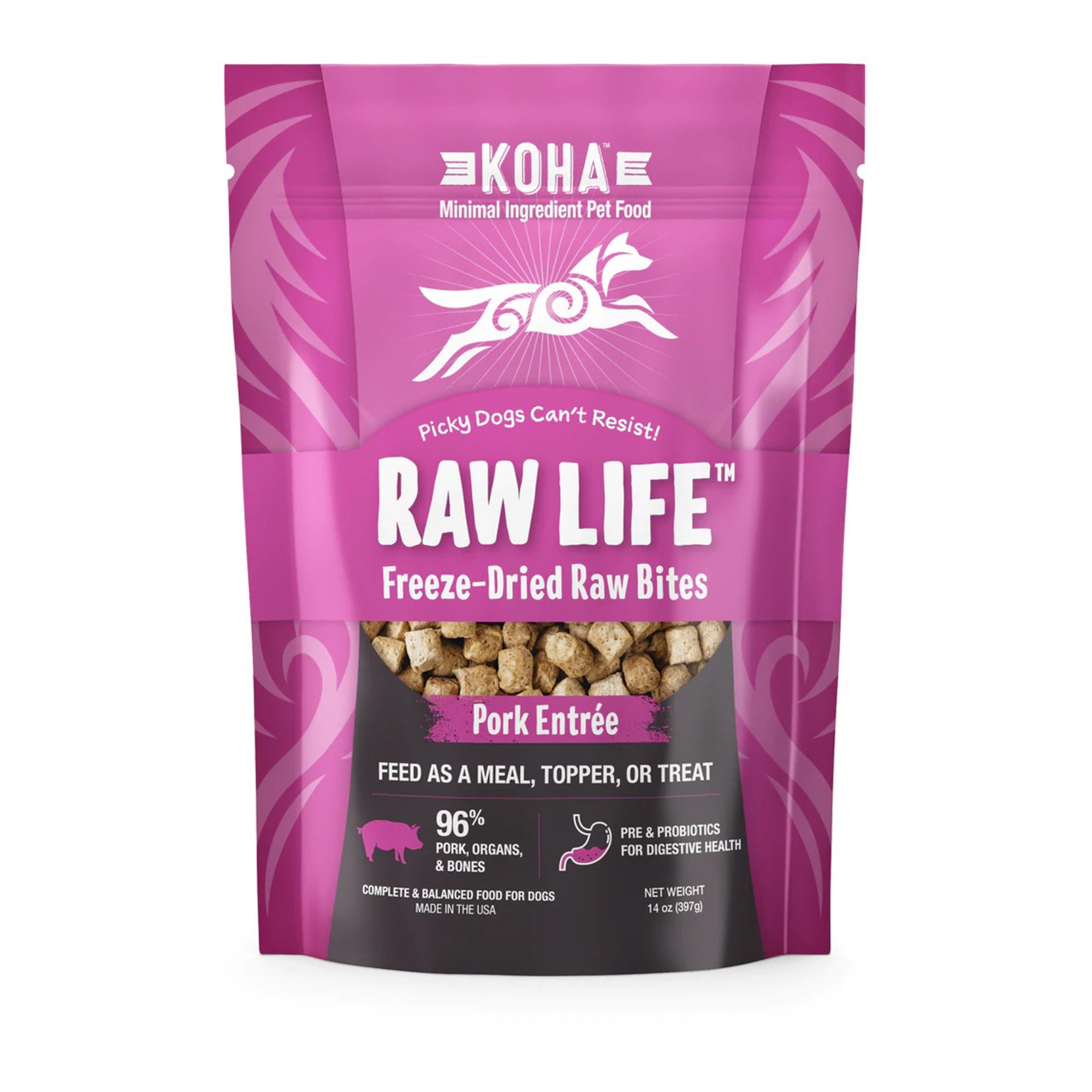 Feed as a complete and balanced meal, use as a topper to make mealtime exciting, or great for a training treat. 96% Meat, organs, and bone Made with human grade ingredients Locally sourced meats, made in the USA Minimal Ingredients for easy digestions and optimal nutrition Pre & Probiotics to support digestive health Antibiotic and hormone free Small batches made for quality and safety assurance Freeze-dried meat offers the taste dogs crave with maximum nutrition Convenient way to feed raw protein No more struggling with picky eating KOHA RAW LIFE Freeze-Dried Raw Bites Pork Entre for Dogs is formulated to meet the nutritional levels established by the AAFCO Dog Food Nutrient Profiles for All Life Stages, including growth of large size dogs (70 lbs. or more as an adult). Made in the U.S.A.