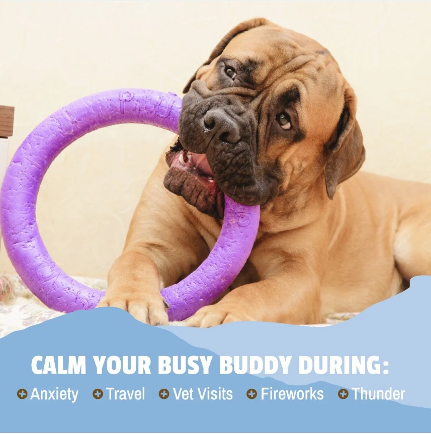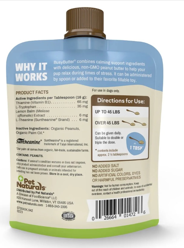 Calming® peanut butter keeps your pupper calm long after they’ve licked it up! With an easy squeeze pouch, BusyButter® can be added to a LickiMat or fillable toy to keep playtime going at home or on the go. Our calming formula features four effective ingredients, including L-theanine and lemon balm combined with pup-approved peanut butter. It’s even OK to give your dog an extra serving (or more!) to keep ‘em busy and happy!