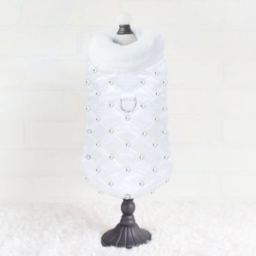 Elevate your baby's wardrobe with the stunning Glamour Baby Dog Coat by Hello Doggie! Handcrafted from luxurious diamond quilted fabric and lined with soft Big Baby fabric, it ensures that your furry baby feels as fabulous as they look. Adorned with Swarovski Crystals, each crystal is hand placed adding a dazzling touch of glamour that sets your baby at the center of attention. Designed for convenience, the Glamour Baby Dog Coat features adjustable Velcro straps, allowing for effortless dressing and undressing. The included D-ring ensures secure leash attachment, making every outing a safe and stylish affair. This versatile coat can be worn alone or paired with our fabulous selection of tees and sweaters, offering endless mix-and-match possibilities to create the perfect outfit for any occasion in the most glamorous way. Spot Clean Only.