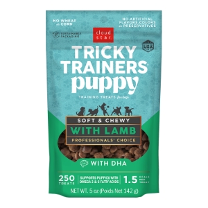 Pet parents, get ready to train your puppy like a pro with Cloud Star Tricky Trainers Mini with Lamb Puppy Soft & Chewy Dog Treats. These soft and chewy treats have been the go-to choice for professional trainers since 1999. Made with wholesome ingredients, these highly aromatic treats are perfect for rewarding your puppy during training sessions or any time they exhibit good behavior. Each treat has only 1.5 calories and is packed with essential ingredients like DHA for cognitive development and omega-3 and -6 fatty acids for a healthy coat. Plus, with the delicious lamb flavor, your puppy will be focused and motivated to learn new tricks with ease. And, as pet parents, you can feel good about giving your new furbaby these treats as they are free of wheat, corn, artificial flavors, colors, and preservatives. The soft and chewy texture also makes them easy to break into smaller pieces and perfect for your growing four-legged family member’s chewing needs.