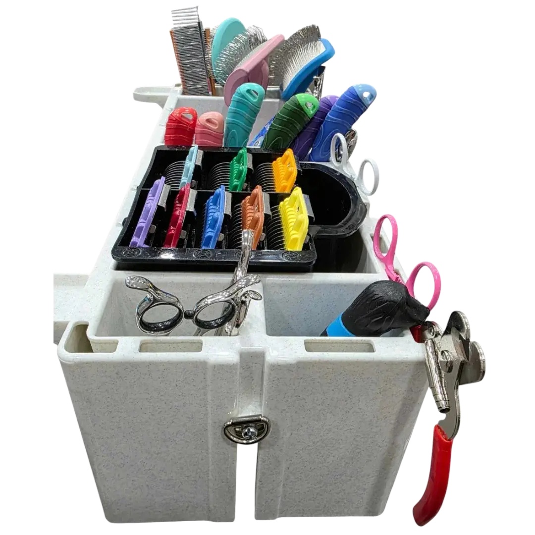 Large, open compartments store various types of brushes (slicker, pin, bristle) and combs (greyhound, shedding, de-matting)