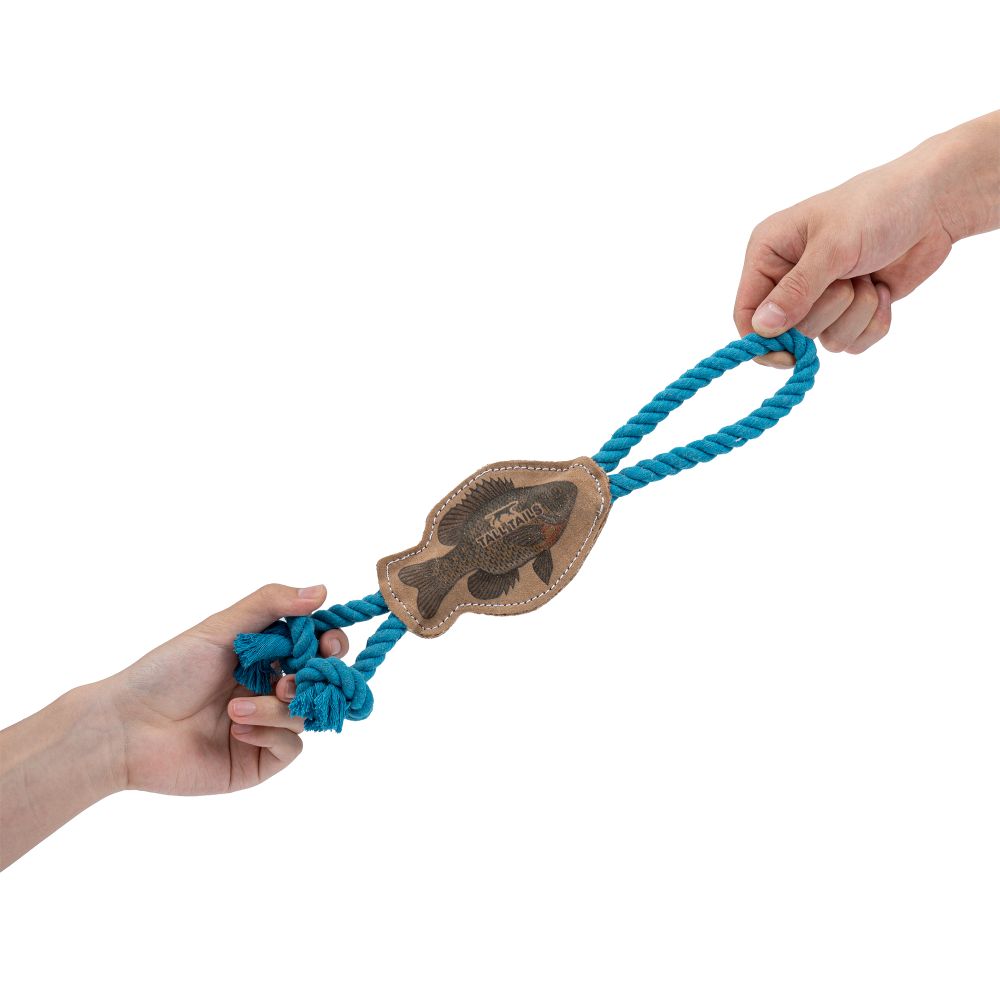 Whether your pup wants to play a rousing game of fetch or tug-of-war, this Natural Leather Fish Tug Dog Toy is made with you and your pup in mind. No toxic chemicals, artificial coloring, or simulated flavoring are used in the production process. This toy is made for dogs who love to retrieve and tug, but is not recommended for aggressive chewers.