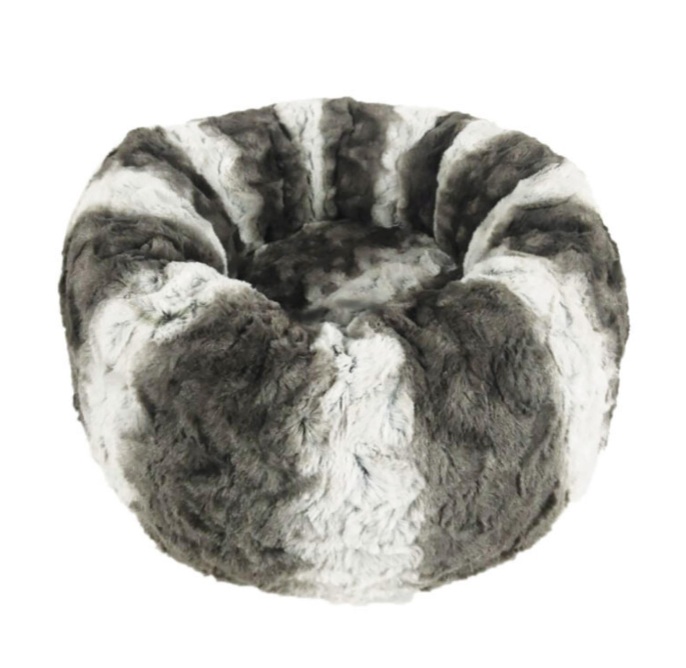 All around faux fur fabric inside and out. Calming style bed provides a sense of security for small pets that love to curl and cuddle. 100% recyclable fill. Machine washable.
