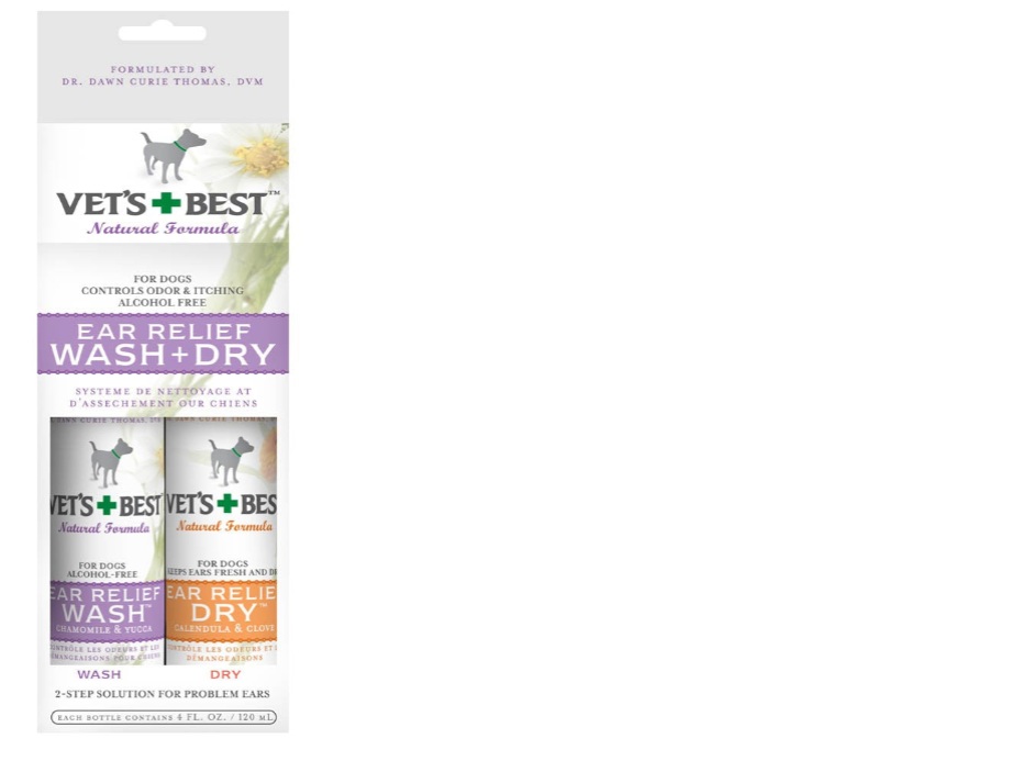 Clean and soothe raw, itchy, and smelly dog ears, and keep them fresh and dry between baths with Vets Best Ear Relief Wash & Dry Ear Cleaner Kit. Our two-step set uses two unique, carefully formulated blends of natural ingredients (aloe vera, echinacea, chamomile, tea tree oil, calendula, and clove oil) to control odor, itching, and discomfort. Both formulas are alcohol-free and non-stinging. COORDINATED TREATMENT - Vet's Best Dog Ear Relief Wash & Dry Cleaner Kit cleans and soothes raw, itchy, and smelly dog ears, and keeps dog's ears fresh and dry between baths.|FAST AND EFFECTIVE - Ear Relief Wash provides fast, effective relief from red, raw, greasy, itchy, and irritated ears.|LASTING RESULTS - Ear Relief Dry helps to extend the time between ear cleanings.|NATURAL INGREDIENTS - Both formulas contain natural ingredients in gentle and soothing combinations, including chamomile, clove oil, tea tree oil, and aloe vera.|MADE IN THE USA - Both formulas are alcohol-free and non-stinging. br/>Sold in Quantity of:1