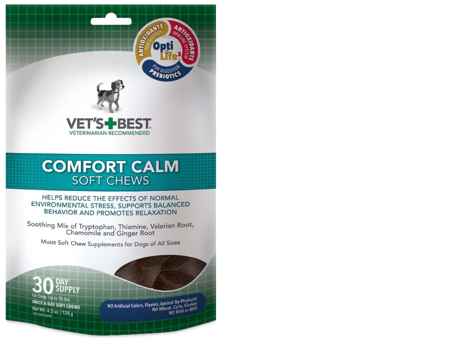 Vets Best Comfort Calm Soft Chews promote calm and balanced behavior in nervous, hyper, or discontented dogs. A vet-formulated blend of plant-based ingredients in each once-a-day soft chew supports non-drowsy relaxation and helps reduce separation anxiety. The OptiLife3 Formula provides antioxidants and prebiotics to support healthy immune and digestive systems, and reduce the effects of normal environmental stress. Our chews are extra moist, great-tasting, and made for optimal absorption. Made with quality globally sourced ingredients.
