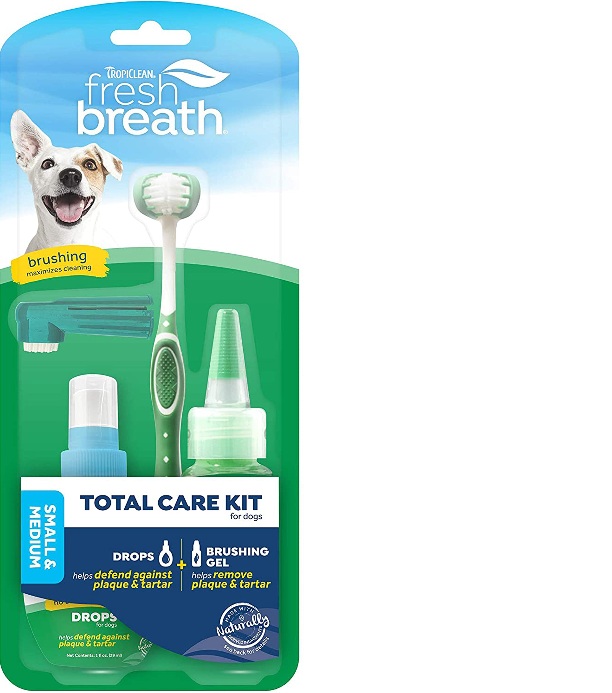 Fresh Breath by TropiClean offers many oral care solutions to help make your dog's dental care routine easier! By using Fresh Breath by TropiClean's Total Care Kit, you can support your dog's oral health and give them fresh breath! This all-inclusive kit is a great foundation for your dog's oral care routine. The Fresh Breath by TropiClean Total Care Kit includes one TripleFlex Toothbrush, a Gentle Finger Brush, 2oz. Brushing Gel and one 1oz. Drops Water Enhancer. Use in combination with Fresh Breath by TropiClean Advanced Whitening Oral Care Water Additive and Fresh Breath by TropiClean Dental Chews or Dental Sticks for maximum oral care protection. br/>Sold in Quantity of: 1