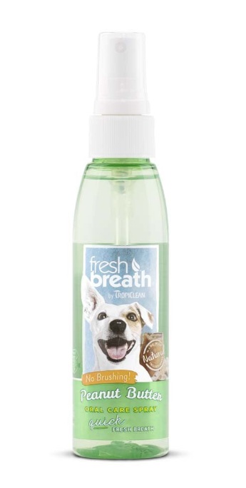 Bad breath can be one of the first signs of oral disease. In fact, 80% of dogs and 70% of cats show signs of oral disease by age 3. Fresh Breath by TropiClean Peanut Butter Fresh Oral Care Spray quickly freshens breath, while supporting a bright smile, in fun flavors that dogs love. No brushing required! Simply spray into your pets mouth and enjoy instant fresh breath! Quickly freshens breath, while supporting a bright smile. Purified Water, Glycerin, Natural Derived Alcohol, Artificial Peanut-Butter Flavor, Citric Acid, Green Tea Leaf Extract, Zinc Chloride (.01g/10ml), Chlorophyll." Ingredients: ",Purified Water, Glycerin, Natural Derived Alcohol, Artificial Peanut-Butter Flavor, Citric Acid, Green Tea Leaf Extract, Zinc Chloride (.01g/10ml), Chlorophyll. br/>Sold in Quantity of: 1