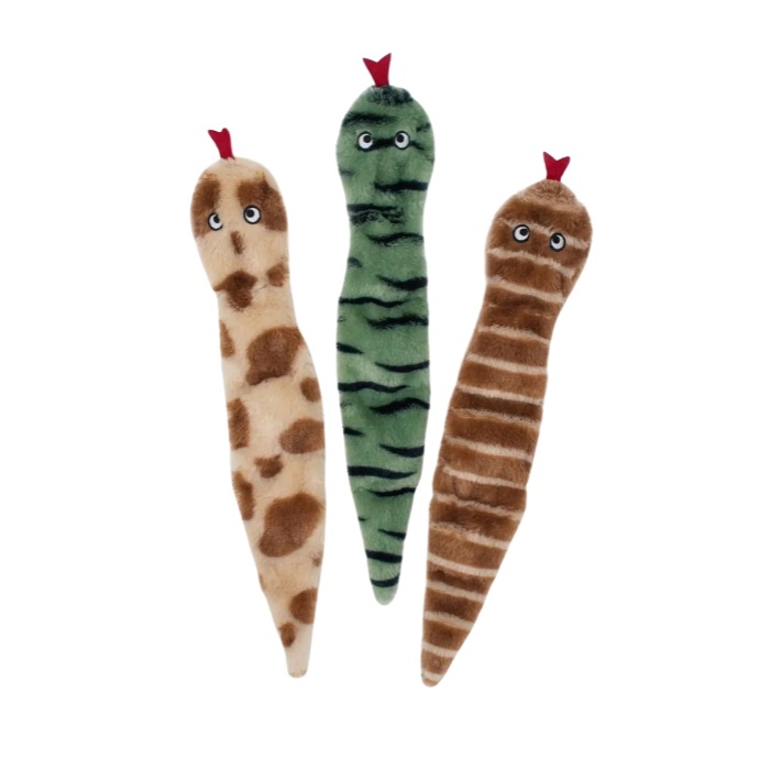 Featuring serpentine versions of our classic Skinny Peltz, this trio of Desert Snakes critters is ready for some squeaking, tugging, and fetching fun! And with no stuffing, Skinny Peltz produce less mess when torn apart.