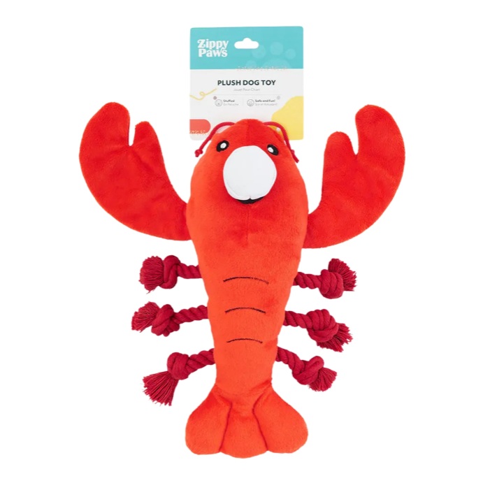 Feeling bored, doggo? Never fear, Luca the Lobster is here for some playtime fun! This adorable red lobster is made of soft plush and features cotton rope legs, embroidered details, crinkle claws and string whiskers.