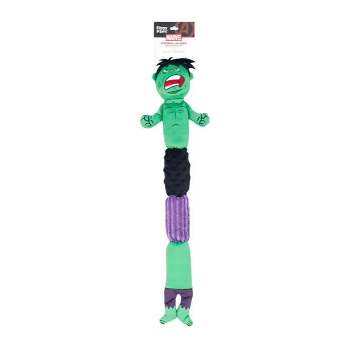 ZippyPaws Caterpillar reimagined with Hulk specific colors on multiple materials. Features multiple squeakers, attached legs and feet, and adorable stitched and embroidered details.