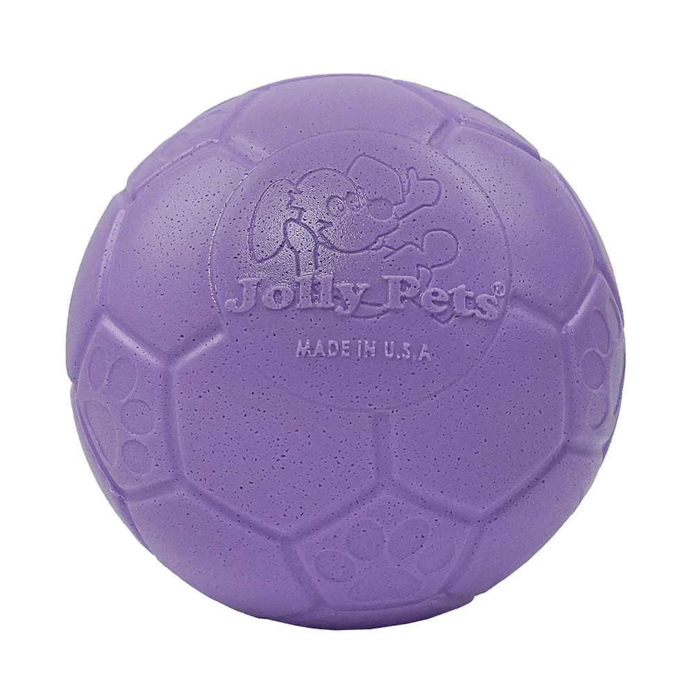 Get ready to score big with the Jolly Soccer Ball Dog Toy! This isn't your ordinary toy - it's a game-changer that will have your pup jumping for joy! The Jolly Soccer Ball can take a beating and keep bouncing back for more. Made from our signature JollyFlex material, your pup can give it their all without popping their playmate. It's time to unleash their inner soccer star! Looking for some splashin' good fun? Look no further! This ball is designed to float, making it the ultimate water toy for your furry water lover. Whether it's a dip in the pool or a trip to the beach, the Jolly Soccer Ball is ready to make a splash and keep the good times rolling. Medium 6". Scented - Light Purple smells like Grape. Made in the USA.
