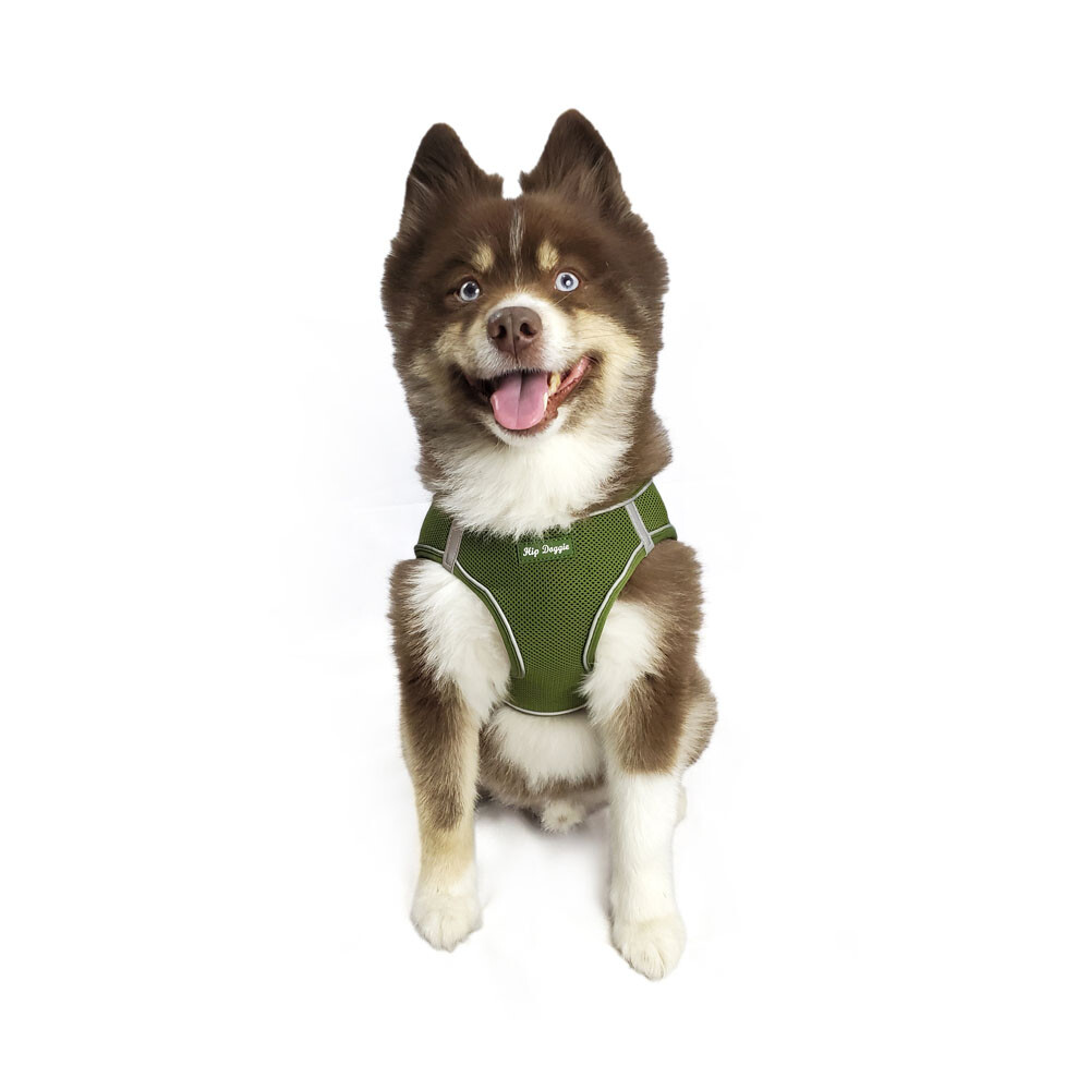 EZ Step-In Mesh Harness Vest - Olive Green, No Choke Design - Pulls on Chest, Not Neck. Step-in Design for Easy ON, Easy Off - Not Over Head. High Quality Quick Release Buckle. Reinforced D-Ring. Reflective Safety Striping. High Quality Breathable Mesh. Safe and Secure.