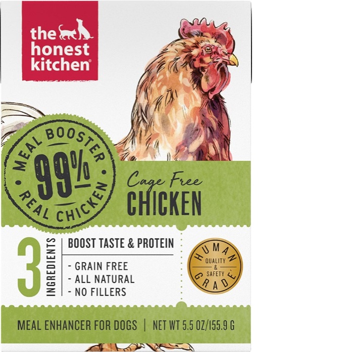Take their meals from basic to bowl-licking-good with the Honest Kitchens 99% Meat Toppers for dogs, made with just 3-4 ingredients, including cage-free chicken, cage-free turkey & duck, ranch-raised beef or wild caught salmon with pollock. The meat of the matter They're protein-packed, grain-free and always 100% human grade. All ingredients are processed in the USA in a human grade food processing facility. They are non genetically modified and free of any chemicals & preservatives. All meat is hormone and antibiotic free.
