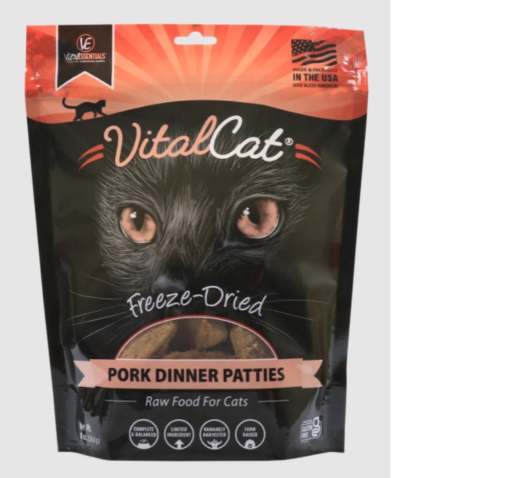 Vital Cat Freeze-Dried Pork Dinner Patties cat food is made from pure, raw, pork. We never use added fillers, flavoring or rendered by-products. Limited ingredient, high protein, grain free cat food will have your cat eager and excited for mealtime. We use a 48-hour slow freeze-drying process that locks in the natural flavor, texture and freshness of the meat without compromising the nutritional value. A healthy, nutritious and delicious way to feed your cat a raw diet.Pork, pork liver, pork spleen, herring oil, mixed tocopherols (preservative), vitamin E supplement, zinc amino acid complex, iron amino acid complex, copper amino acid complex, manganese amino acid complex"