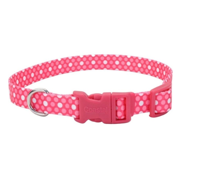 Coastal Pet Attire Styles Adjustable Collar Pink Dot 1X18-26in Our Pet Attire Styles Adjustable Dog Collar is smooth and comfortable and features a contoured snap-lock buckle. Our Pet Attire Styles Adjustable Dog Collars feature fun, fashionable sublimated pattern collars have color coordinated hardware. This Product/Package Measures: 14.00 in. L x1.50 in W x1.50 in D br/>Sold in Quantity of:1
