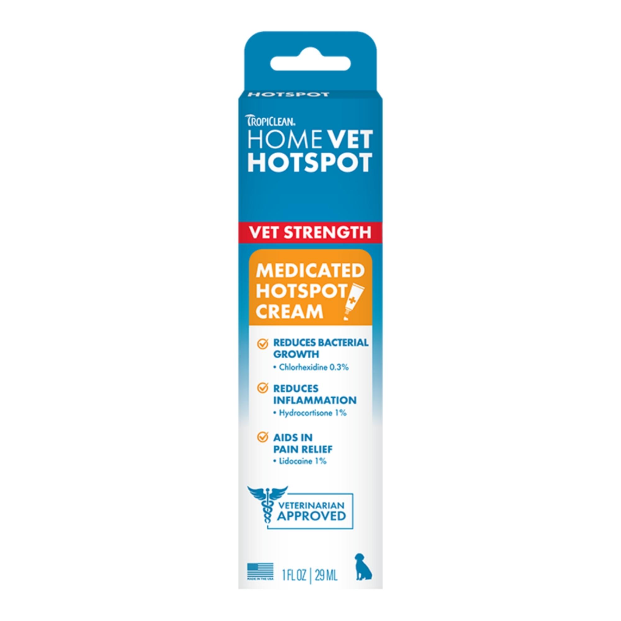 TropiClean HomeVet Medicated Hot Spot Cream delivers fast, targeted relief for dogs suffering from hot spots, bites, scrapes, or inflamed skin. This vet-strength formula combines lidocaine to soothe pain and itching, hydrocortisone to calm redness and swelling, and chlorhexidine to fight germs at the source. Designed as a first-aid essential for every pet parent, this dual-action dog cream helps relieve discomfort while supporting skin healing. Gentle yet effective, it’s safe for routine use on irritated, raw, or sensitive areas—keeping your dog comfortable and protected.