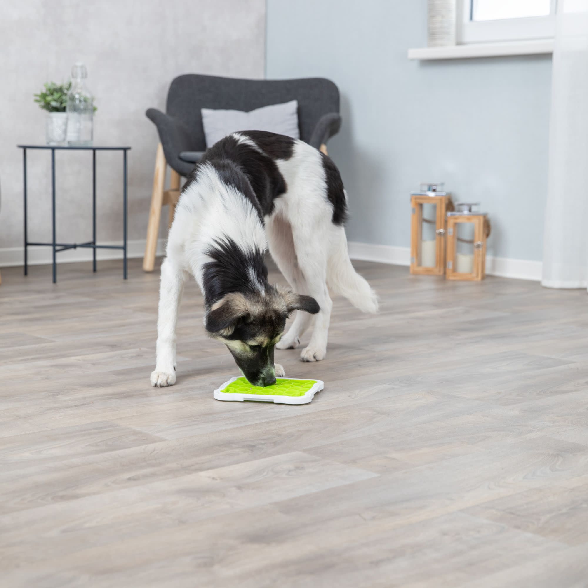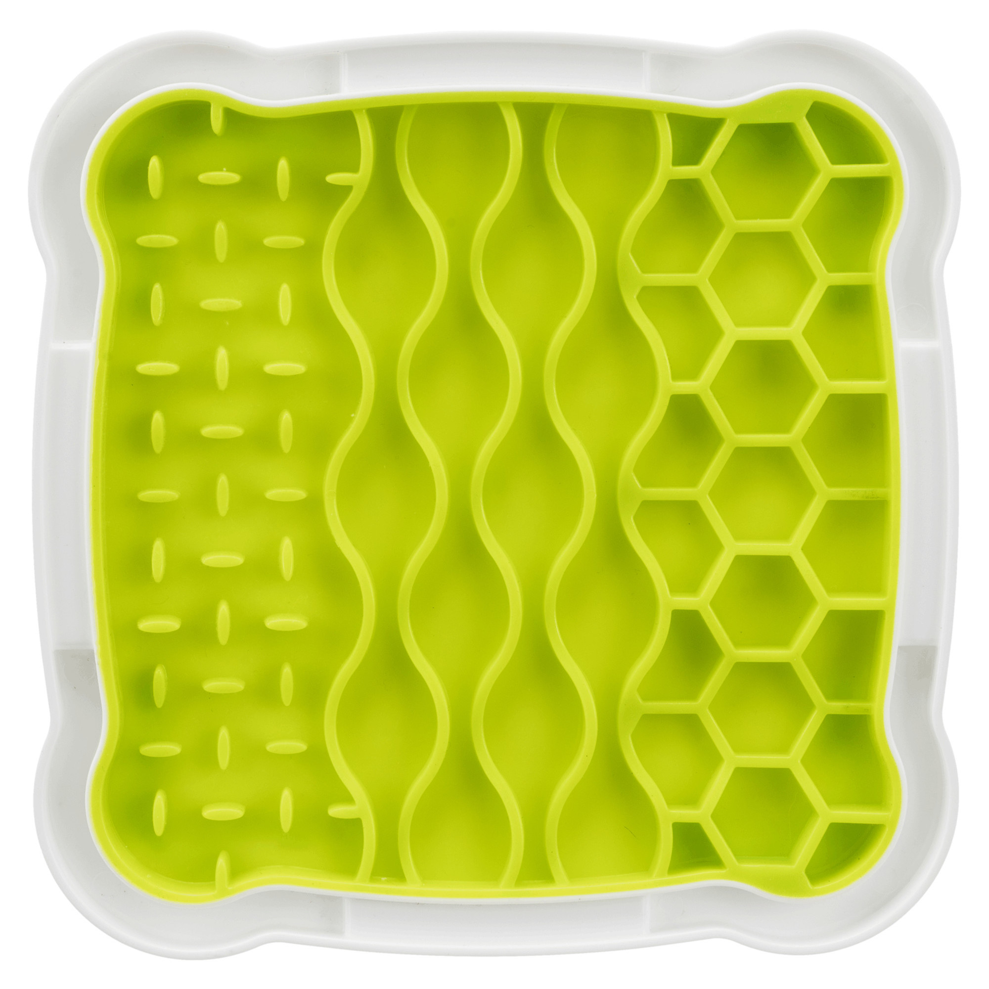 TRIXIE Lick'n Snack Licking Plate is fun, engaging, and an interactive way to feed your cat or dog. The licking mat slows down your pet's eating which improves digestion and minimizes bloating. Use the licking mat to relieve anxiety during grooming sessions, like nail trimming and bath time. Does your pet get stressed during a thunderstorm? Place their favorite flavor on the licking plate to keep them distracted. It can be coated with pastes, wet feed or dairy products, fill with snacks and freeze for a fresh surprise. The raised edge prevents food from spilling out. Easy to clean.