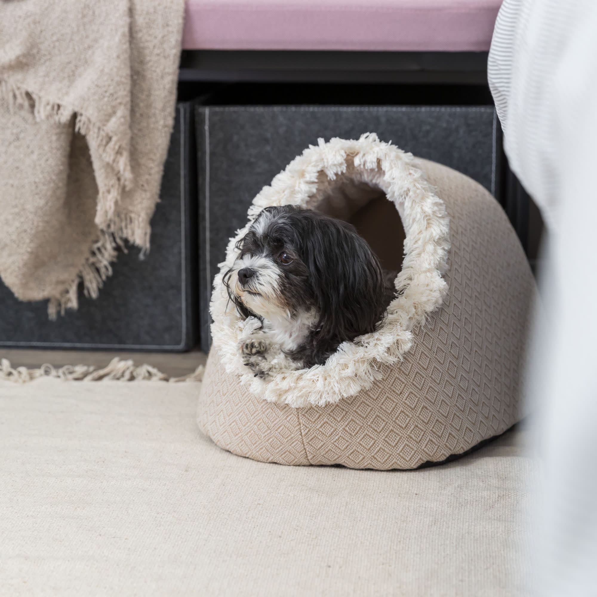 The TRIXIE Boho Cave will provide great comfort and seclusion for your cat to relax. This cat retreat combines the best of both worlds: a peaceful hideaway and stylish furniture to compliment any decor. Outfitted in trendy neutral Boho chic jute/cotton mix fabrics, this bed will have your cat fast asleep with these laid-back vibes. The inner bed reversible cushion provides an extra thick bottom for your pet’s comfort and support. An anti-skid base keeps the bed from sliding around. Suitable for cats and small dogs to take the purr-fect nap.
